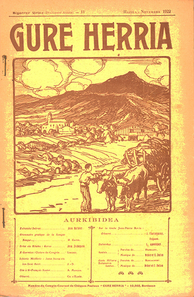 Dassance, Louis. L'Abbé Darrigol et le Prix Volney de 1829 Jean Barbier. Supazter chokoan: Ezkila charmatua P. Yturbide. La Vicomté de Macaye (suite) P. Ithurralde. Pastoralez H. Gavel. Un Pélerin de Saint-Jacques au Pays Basque à la Fin du XVeme siècle Oxobi. Haurren chokoa: Ttirritta eta chinhaurria (Alegia) Soholuztarra. A Guernica: Impressions d'un Congressiste Larreko. Eskualdun biozduna Mexiko'n Aztapar. Phereka eta zimiko J.L. Marruma L. Apeztéguy. Ilabetekoa Nehor et C. Dufau. Chori Berriketaria Elissamboure. Chori Berriketaria Nehor et C. Dufau. Galerianoaren Kantuak Bordachuri. Galerianoaren Kantuak