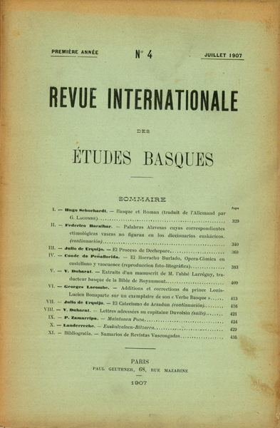 - Campión, Arturo. Defensa del nombre antiguo, legítimo y castizo de la lengua de los Baskos contra el soñado Euzkera Carmelo de Echegaray. Calígrafos vascongados.- Juan de Iciar (fotograbado) G. Hérelle. Les Représentations de Pastorales Basques J.B. Daranatz. Importantes découvertes de monnaies romaines au Pays Basque (avec photogravures);Julien Vinson. Observations sur le N.T. de Liçarrague Jean de Jaurgain. Le nouveau Testament de Liçarrague Arturo Campion. Sobre los nombres de la antigua Baskonia Jean de Jaurgain. Corisande d'Andoins, Comtesse de Guiche et Dame de Gramont J. B. Darricarrère. Eresiak eta Hipuinak George Lacombe. Wentworth Webster X. Euskal-Esnalea