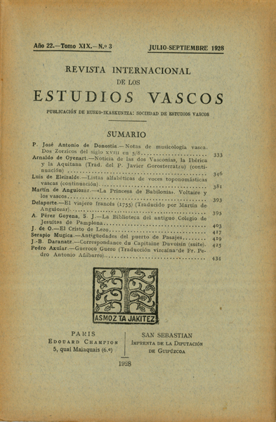 Spitzer, Leo. Atlas linguistique ou grammaires-dictionnaires-textes? H. Wilkinson. Croquis de paisajes en la Provincias Vascas de España (traducción del inglés por 'Martín de Anguiozar') Odon de Apraiz. Las milicias vascas en el siglo XVIII Angel Irigaray. Una variante del cantar de la palaciana de Tardets Arnaldo de Oyenart. Notica de las dos Vasconias, la Ibérica y la Aquitana (Trad. del P. Javier Gorosterratzu) (continuación) J.B. Daranatz. Correspondance du Capitaine Duvoisin (suite) G. Bähr. Estudio sobre el verbo guipuzcoano (continuacaión) Wilhelm Giese. Iru estudiante Wilhelm Giese. Contribución a la terminología militar vasca Juan Carlos de Guerra. Algo más sobre la canción de Martín Bañez Jose Antonio de Donostia. Apuntes de Folklore Vasco