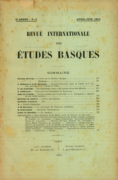 - Herelle, G. Les Repreésentations de Pastorales Basques dans la Soule pendant la période révolutionnaire V. De Monzon. Un 'Minué' del Tamboril ( 4-1-1 ) Domingo de Aguirre. Garoa (jarraipena) Julien Vinson. Le Calendrier basque Georges Lacombe. Nota Bibliographique sur l''Errosariyo' de 1780 Carmelo de Echegaray. ¿Llegaron los Arabes á Guernica? Juan Carlos de Guerra. Ilustraciones Genealògicas (continuación) Telesforo de Aranzadi. La vaca en porciones y nombres vascos de éstas J.-B. Daranatz. Igandea edo Jaunaren eguna C.C. Uhlenbeck. Contribution à une phonétique comparative des dialectes basques.- Deuxième et dernière partie: Consonantisme (traduit par Georges Lacombe) H. Gavel. Le Basque et les Langues Caucasiques (à propos de la réponse de M. Winkler à la critique de M. Uhlenbeck) Dubarat. Lettres adressées au capitaine Duvoisin (fin) Julio de Urquijo. Felipe V en Guipúzcoa Julio de Urquijo. ¿Retrocede el Vascuence? Julien Vinson. Le Vocabulaire de Pouvreau X. Una Joya Bibliográfica Gregorio de Mujica. A propósito de un refrán Julio de Urquijo. Notas de Bibliografía Vasca Julio de Urquijo. Los Agotes en Guipúzcoa